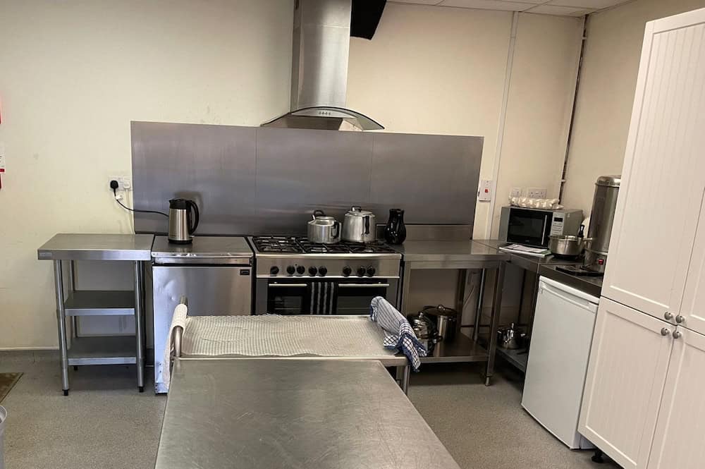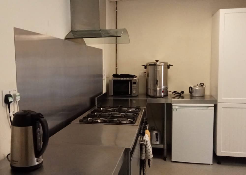 Kitchen facilities for private hire use or for external caterers to bring in prepared food are available. The kitchen is a separate room off to one side of the upper hall and has its own external access door for caterers to use. Use of fridge, cooker, microwave, tea urn, kettle etc. Cutlery and crockery are available.